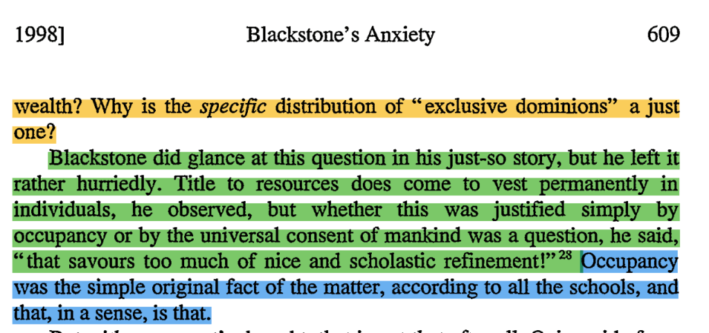 Blackstonian Anxiety, is the property law term coined by creative writer turned property law goddess Carol Rose. For the lazy Googlers, William Blackstone (B:1723) was probably the first legal academic ever. For a cultural reference point, Blackstone’s Commentaries on the Laws of England was what Atticus Finch used to teach Calpurnia to read in To Kill a Mockingbird.