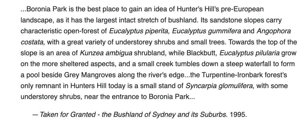 An excellent history of 1800s Boronia Park, it’s verified First Nations archeological sites and its modern day flora and fauna can be found on the Hunters Hill Trust website.
